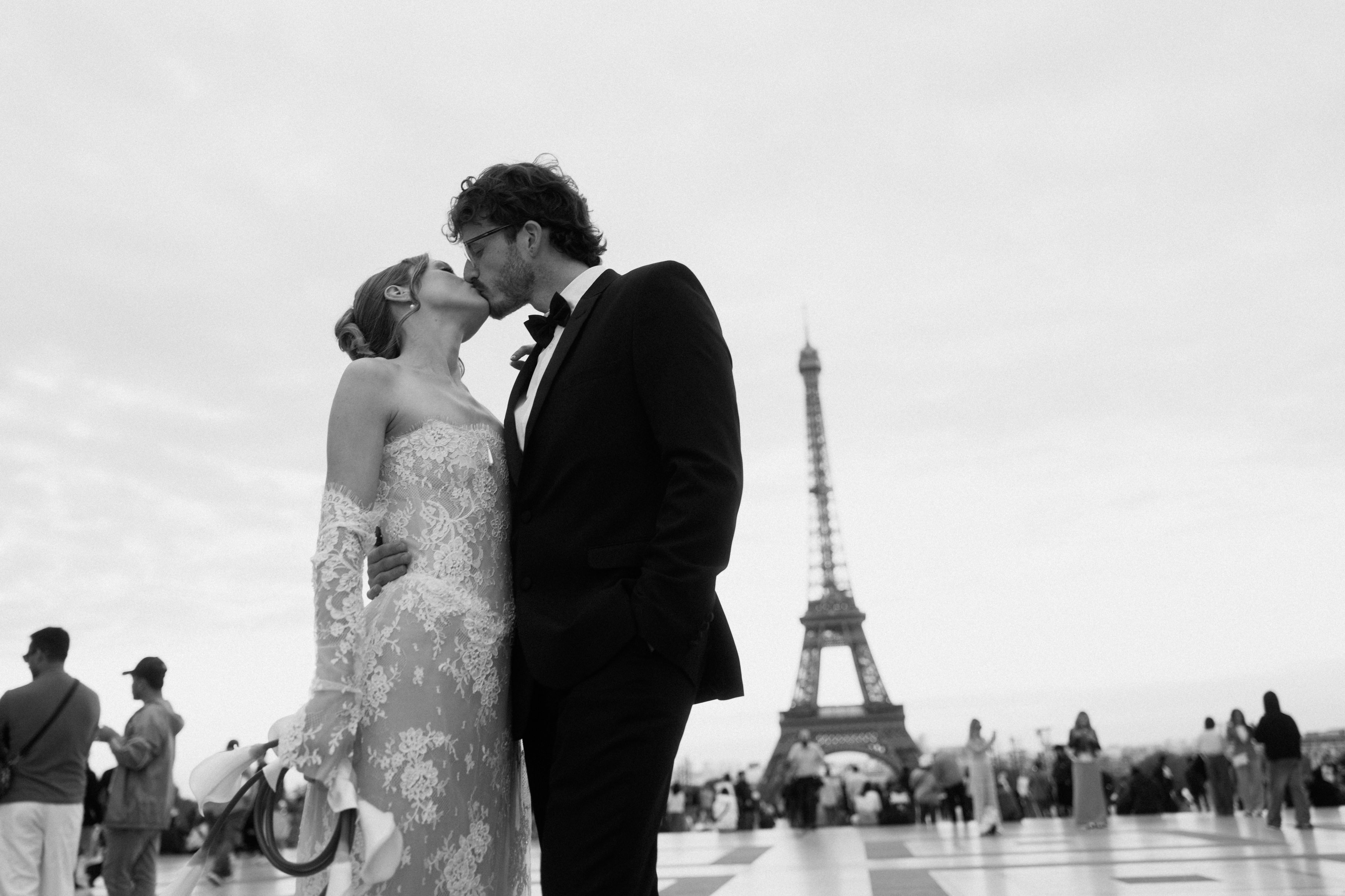 A bride and groom share a kiss by the Eiffel Tower in Paris while people are gathered around them in a busy square.