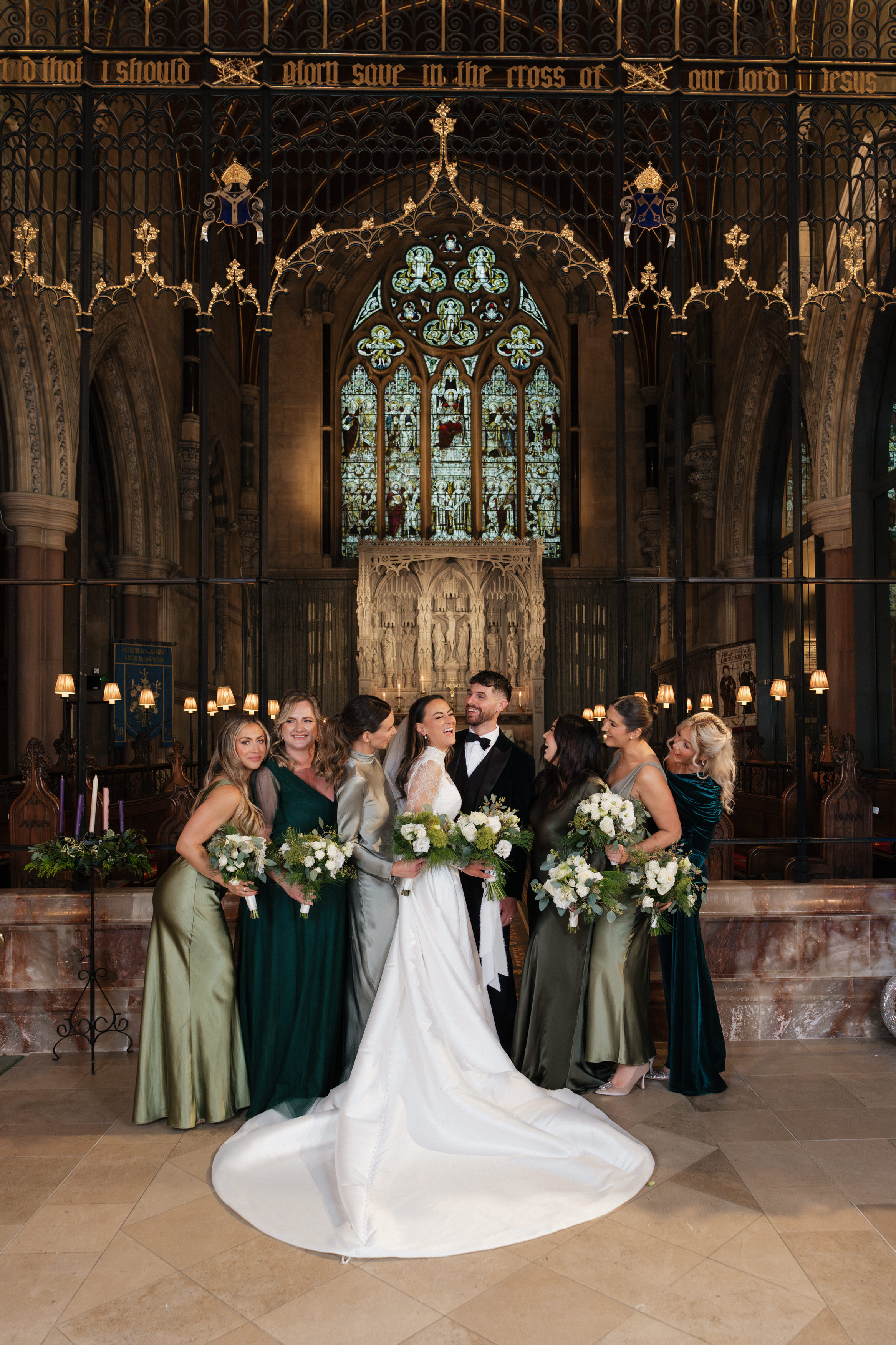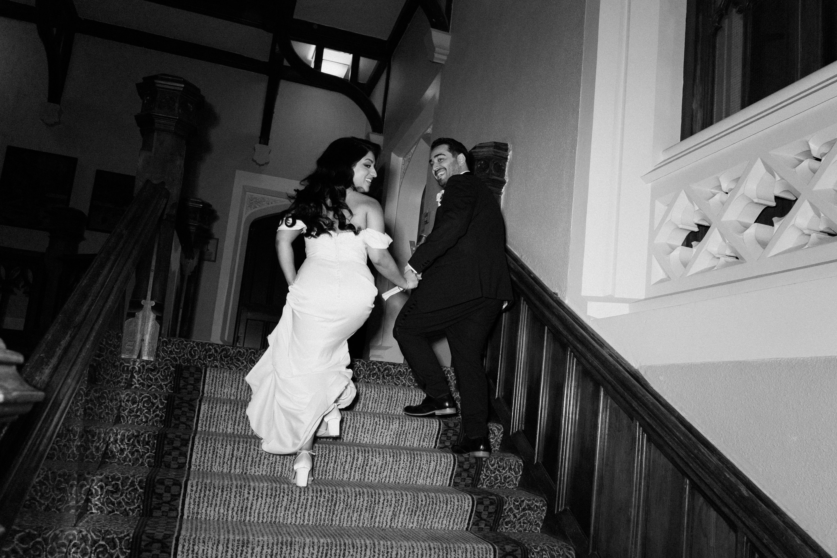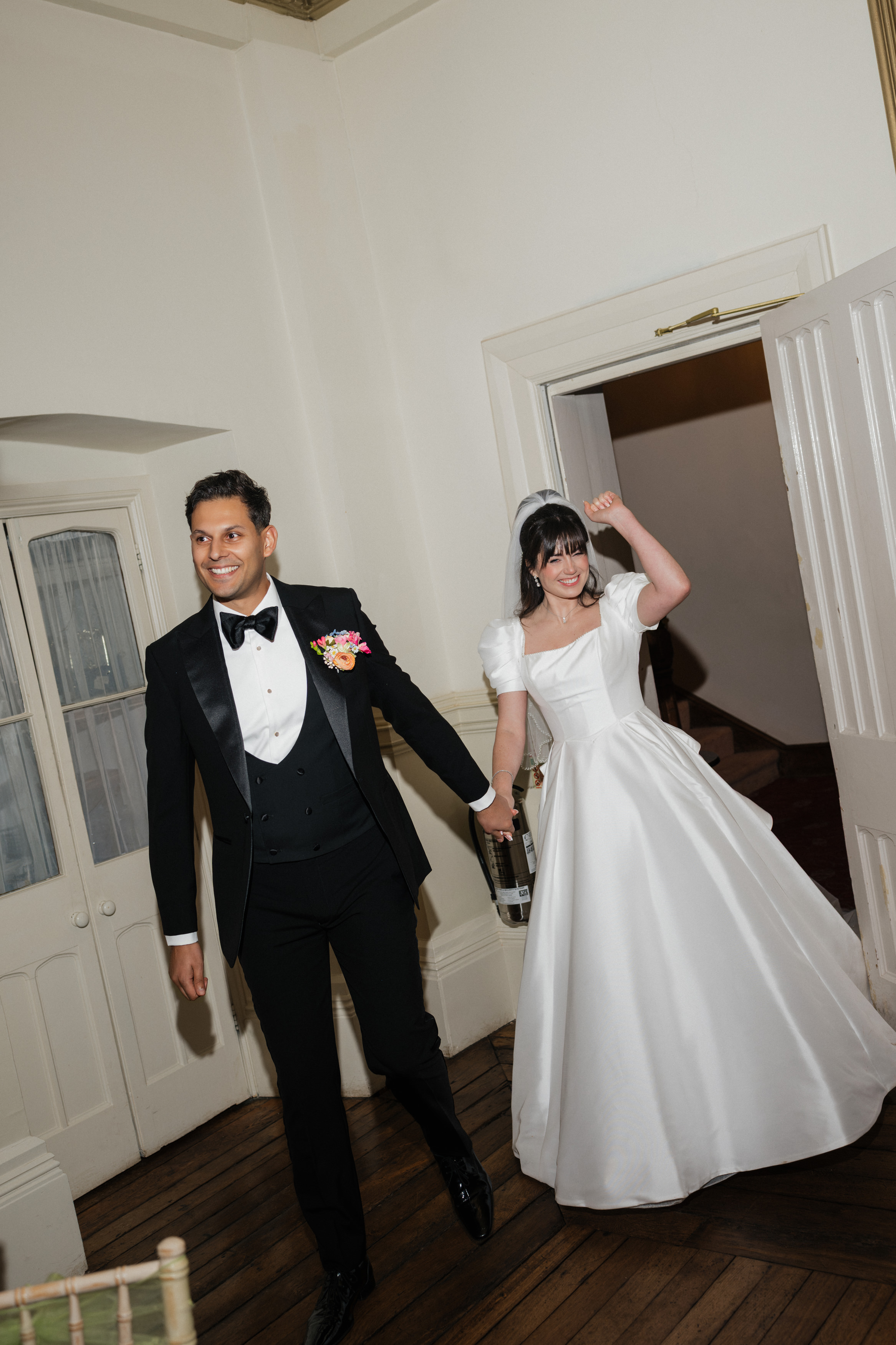 A group of people dressed up nicely walks into a place through big double doors. There's a seating chart on the right side.