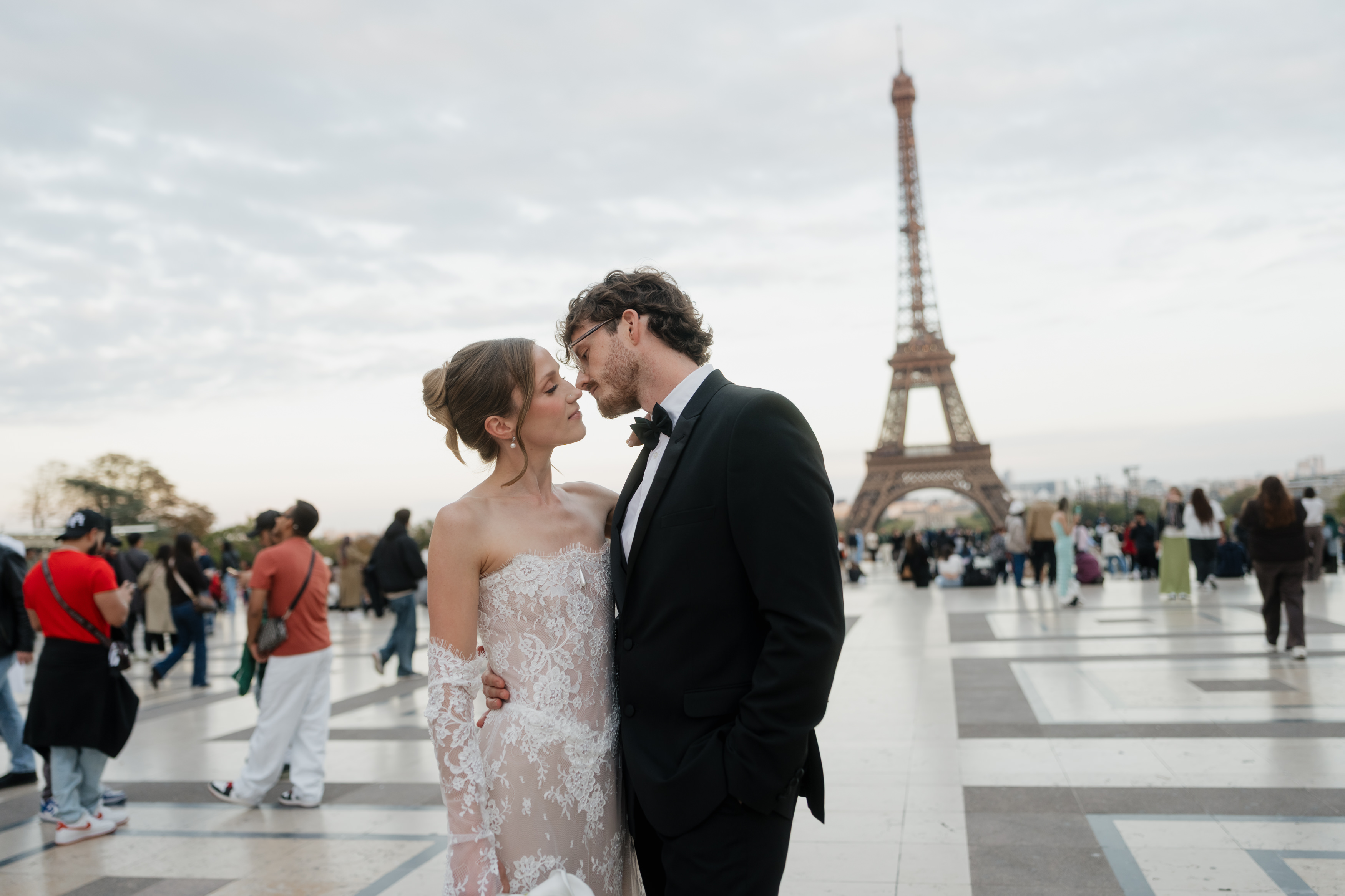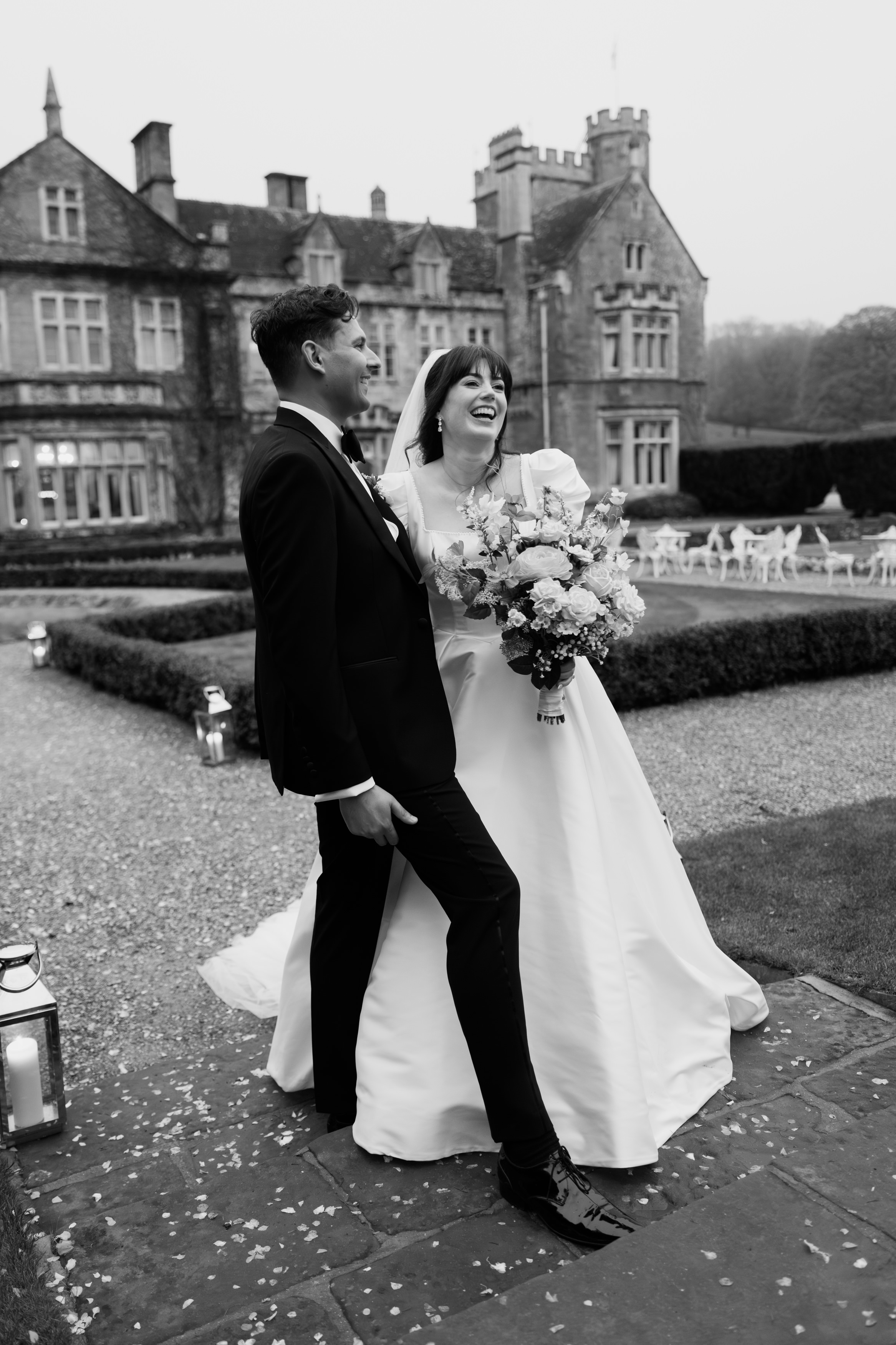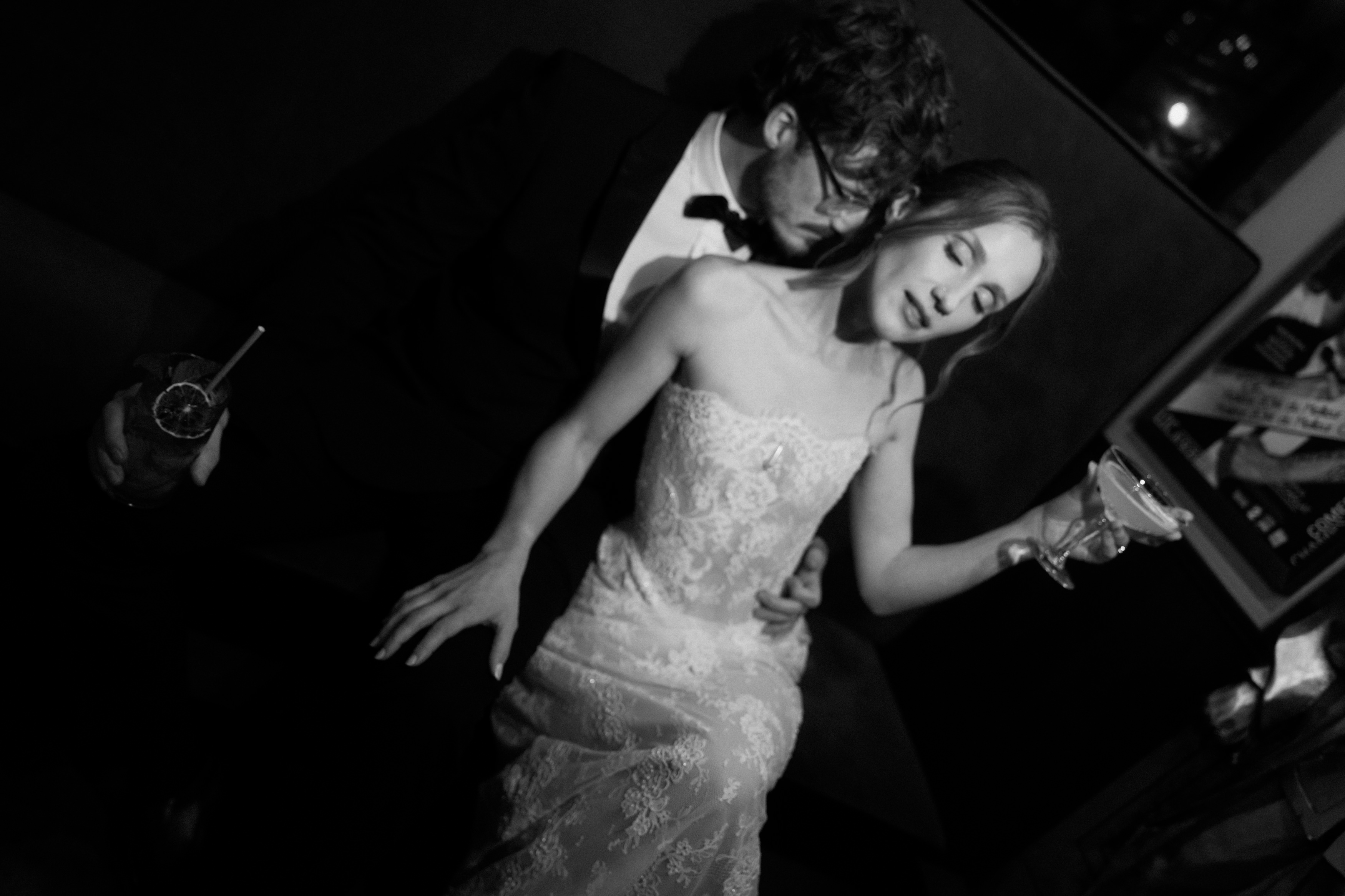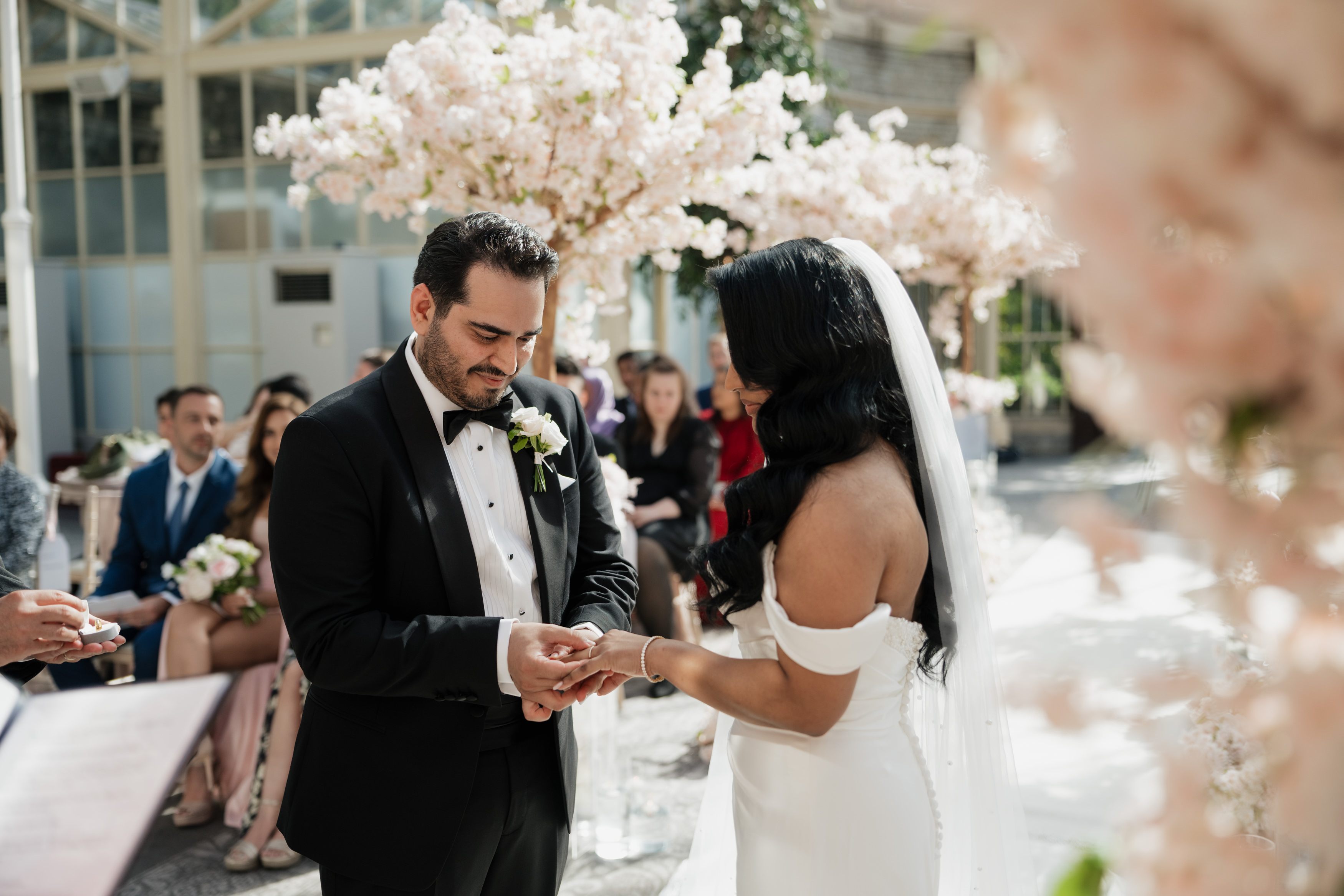 A group of people dressed up nicely walks into a place through big double doors. There's a seating chart on the right side.