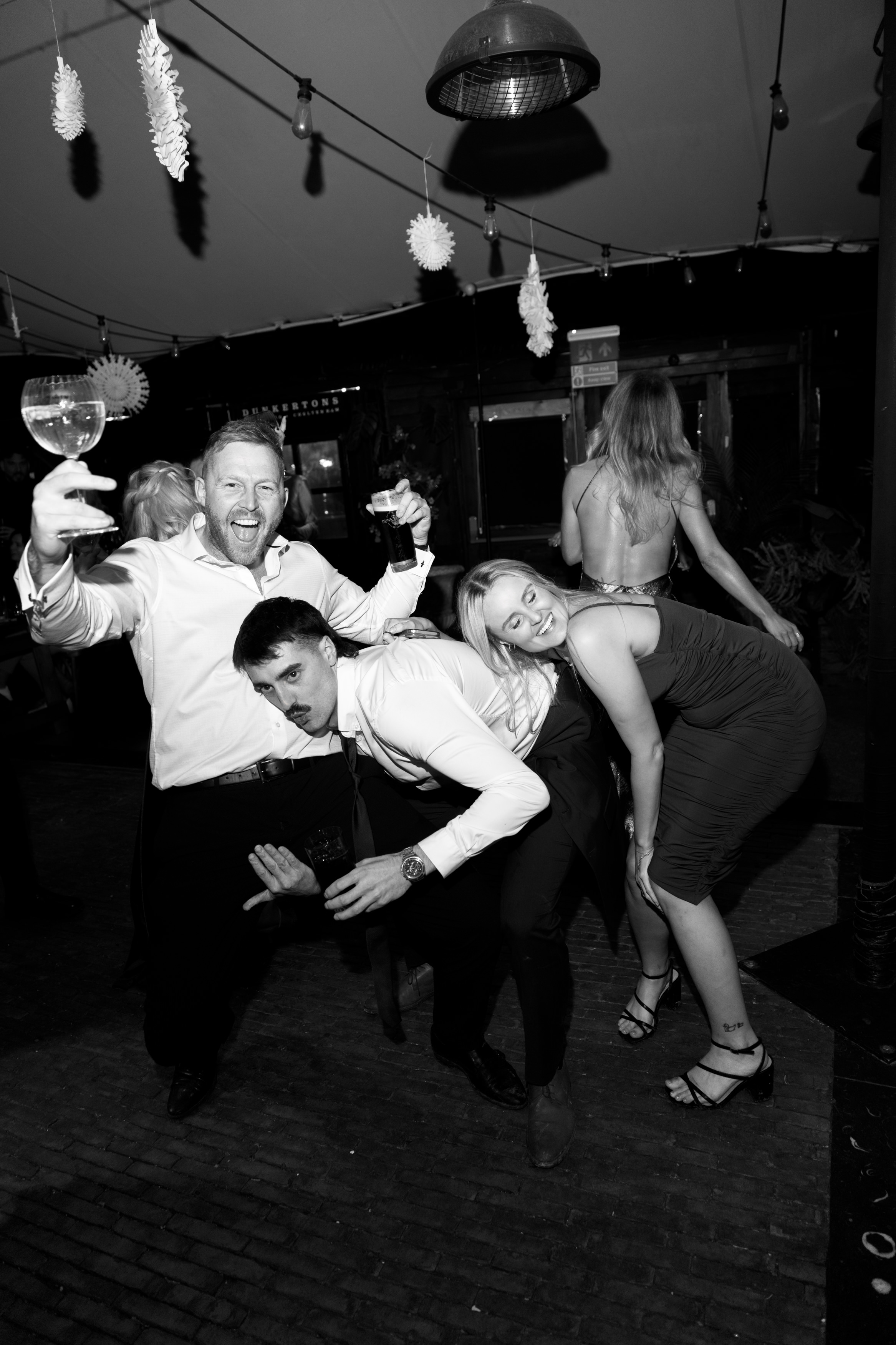 A bunch of people are having a party inside. A happy guy in a suit is being lifted up by his friends, and he's pointing up with both hands. Everyone is excited and having a great time.