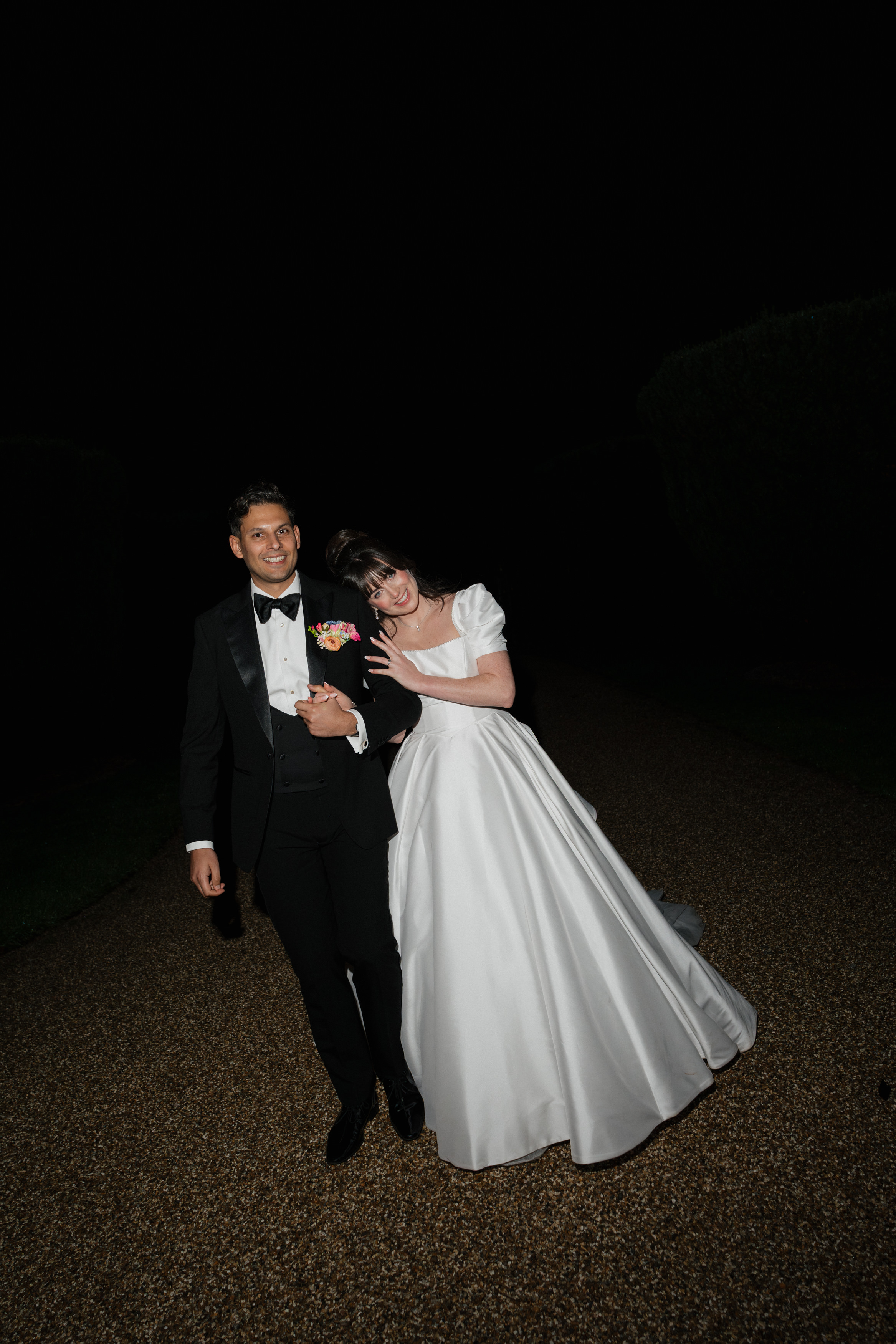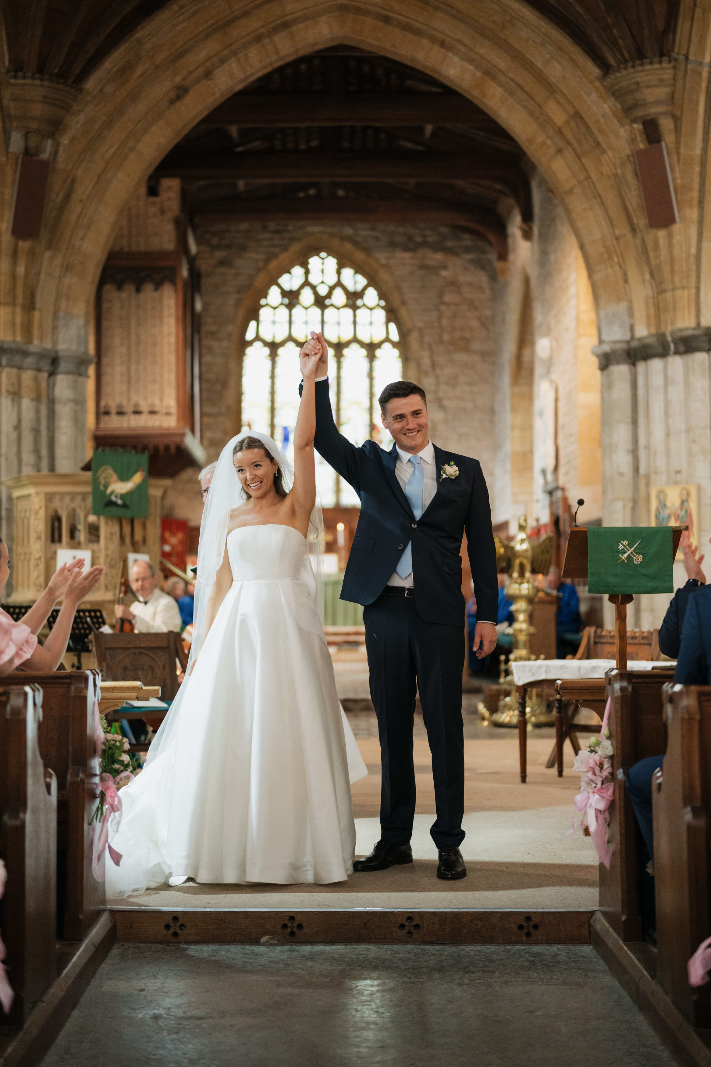 The bride and groom hold hands and smile as guests cheer for them at their wedding in a brightly decorated room.
